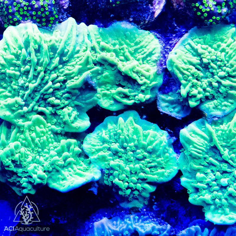 Electrify your reef with the ACI Neon Green Cap (Montipora capricornis). This radiant stunner explodes with electrifying green, making it the life of the coral party.