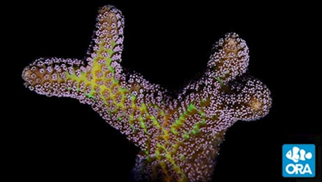 The ORA Bird of Paradise is the most spectacular strain of Seriatopora coral we culture. It has an electric green base with metallic purple polyps. Often, the purple polyps are so well extended that just a glimpse of green can be seen through the swaying polyps. Increasing flow slightly can retract the polyps just enough to see the electric green base while still keeping a healthy specimen. The thick and dense skeletal structure is almost porcelain like and tends to shatter during propagation. The ORA Bird of Paradise looks best under higher Kelvin lighting.