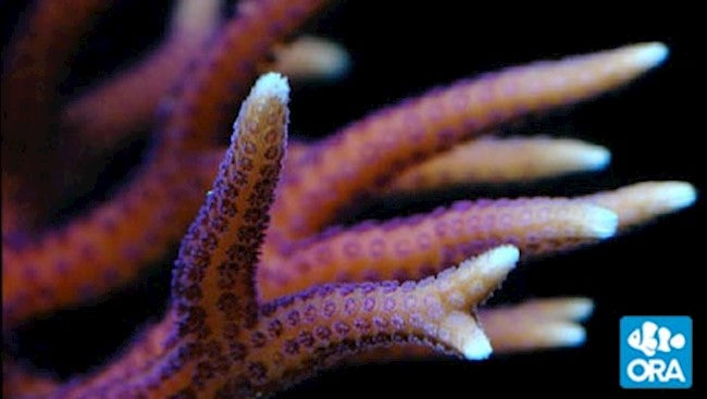 Hyacinth Birdsnest is fine branched Seriatopora having a vivid pink coloration with blue polyps and white growth tips. The elongated, thin branches on the ORA Hyacinth Birdnest have a slight bumpy texture and end in a very sharp point. This coral is very fragile, but grows exceptionally fast so any broken tips will be re-grown in weeks.
